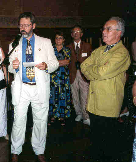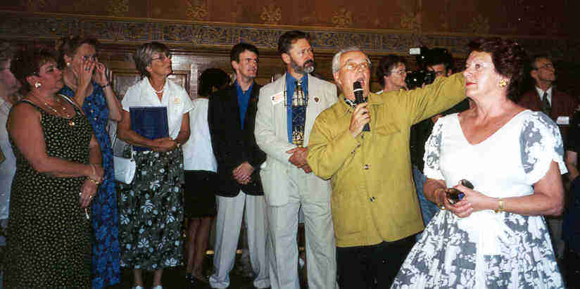 Cousins d'Amérique et compatriotes rochelais sont invités à prendre le verre de l'amitié pendant que Mesdames Yolande Poulin, organisatrice, et Jeannine Ouellet ainsi que M. Guy Perron, président-fondateur du groupement Les Amis de François Peron, s'entretiennent avec un journaliste pour une radiodiffusion sur les ondes de Radio-France.