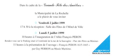 | Parmi eux, les 22 personnes du groupement Les Amis de François Peron sont heureuses de fouler le sol des ancêtres Peron rochelais. Pour quelques-uns, c'est un retour en terre ancestrale, pour d'autres c'est la découverte de la lumière de la ville, de l'écoute du vent chanté dans les haubans, du goût de la pêche rochelaise, de la balade au bord des quais, tout au long des rues piétonnes, sous les arcades. Tous ressentirons l'âme de la cité rochelaise, lieu cher aux descendants de la famille Perron dit Suire d'Amérique. | ![]() |