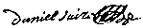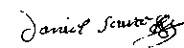 | Pendant son premier voyage au Canada, à 19 ans, notre ancêtre fut présent devant notaire comme témoin. Le 23 mars 1658, il signe « daniel Scuire » avec paraphe. | |