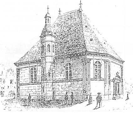 | Le Grand Temple s'élève sur un terrain de la place du Château cédé par la ville aux réformés en 1559. Henri 1er de Condé y pose la première pierre dès 1577, mais la construction n'est entreprise qu'en juin 1600. Orgueil des Rochelais, c'est l'un des plus beaux chefs-d'oeuvre que l'on pouvait voir à l'époque, dit-on. Vaste octogone allongé, au décor corinthien, il est couvert d'une toiture de plomb dont l'immense charpente n'est supportée d'aucun pilier.(dessin de E. Couneau) | ![]() |