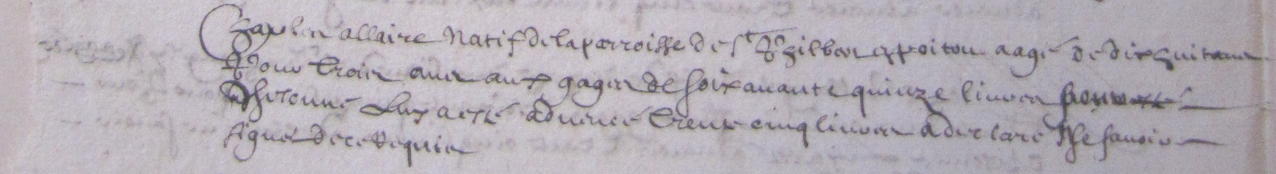 | Fils de Sébastien et de Perrine Florisson, Charles Allaire est baptisé le 2 août 1637 à Saint-Philbert-du-Pont-Charrault, près de La Roche-sur-Yon (Poitou). Il s’engage à 20 ans (et non 18), le 14 ou 15 mai 1658, pour aller travailler durant trois ans à raison de 75 livres par an (avance de 35 livres). Est nourri par François Peron depuis le début du mois de mai et le sera jusqu’au jour de l’embarquement. Ne signe pas. Il quitte La Rochelle le 29 mai à bord du Taureau à destination de Québec où il arrive le 6 juillet. Il obtient une terre vers 1661. Le 23 juillet 1662, il s’engage à épouser Françoise Chapelain. Ce contrat est annulé sans qu’on en connaisse les motifs. Il épouse à Québec, le 10 novembre 1663, Catherine Fièvre, baptisée le 19 novembre 1646 à Saint-André, près de Niort (Poitou), fille de Fiacre et de Jacquette Dusol. De leur union naissent treize enfants. En 1667, il possède 6 arpents en valeur à l’Île d’Orléans. Le 24 janvier 1668, Monseigneur de Laval lui concède une terre à Sainte-Famille (I.O.). En 1671, il obtient une terre à Saint-François (I.O.), où il ira s’installer au printemps 1679. Il meurt au début de 1691. |