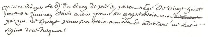 | Originaire de Prié ? (Poitou), laboureur, il sengage à 28 ans, le 25 juin 1663, pour aller travailler durant trois ans à raison de 300 livres de sucre. Ne signe pas. Doit être nourri jusquau jour de son embarquement. Une fois embarqué, il reçoit un habit, deux chemises, une paire de bas de chausse, une paire de souliers et un bonnet. Il quitte La Rochelle le 24 juillet à bord de LAigle Blanc à destination des Antilles où il arrive vers le mois de septembre. |