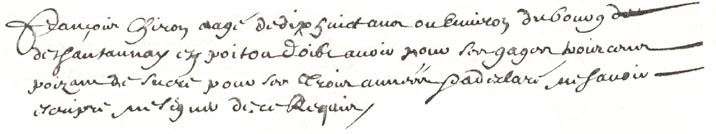| Originaire de Chantonnay (Poitou), il sengage à 18 ans, le 19 juin 1663, pour aller travailler durant trois ans à raison de 300 livres de sucre. Ne signe pas. Doit être nourri jusquau jour de son embarquement. Une fois embarqué, il reçoit un habit, deux chemises, une paire de bas de chausse, une paire de souliers et un bonnet. Il quitte La Rochelle le 24 juillet à bord de LAigle Blanc à destination des Antilles où il arrive vers le mois de septembre. |