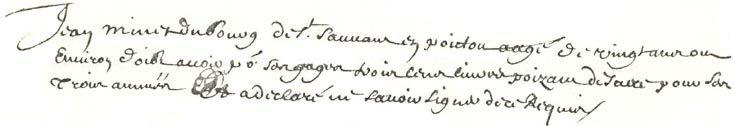 | Originaire de Saint-Sauveur (Poitou), il sengage à 20 ans, le 3 juillet 1663, pour aller travailler durant trois ans à raison de 300 livres de sucre. Ne signe pas. Doit être nourri jusquau jour de son embarquement. Une fois embarqué, il reçoit un habit, deux chemises, une paire de bas de chausse, une paire de souliers et un bonnet. Il quitte La Rochelle le 24 juillet à bord de LAigle Blanc à destination des Antilles où il arrive vers le mois de septembre. |