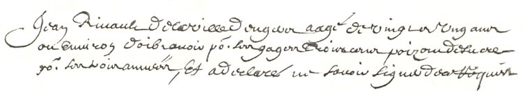 | Originaire dAngers (Anjou), il sengage à 21 ans, le 7 juillet 1663, pour aller travailler durant trois ans à raison de 300 livres de sucre. Ne signe pas. Doit être nourri jusquau jour de son embarquement. Une fois embarqué, il reçoit un habit, deux chemises, une paire de bas de chausse, une paire de souliers et un bonnet. Il quitte La Rochelle le 24 juillet à bord de LAigle Blanc à destination des Antilles où il arrive vers le mois de septembre. |