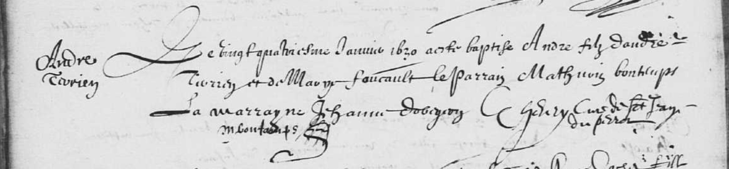 | Fils d’André et de Marie Foucault, André Terrien est baptisé le 24 janvier 1630 dans la chapelle Sainte-Marguerite de La Rochelle (Aunis). Il s’engage à 26 ans (et non 25), le 11 avril 1656, pour aller travailler durant trois ans à titre de laboureur à raison de 75 livres par an (avance de 35 livres). Ne signe pas. Il quitte la rade de Saint-Martin-de-Ré le 30 avril à bord du Taureau à destination de Québec où il arrive le 15 juin. Procès du 1er octobre 1660 à Trois-Rivières. |
