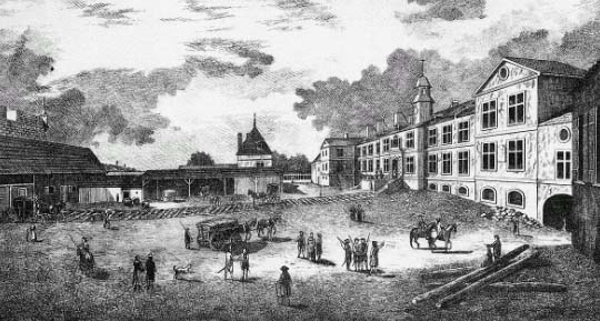 Vue du Palais de l'Intendant vers 1760 Gravure de RichardShort, dessiné à l'encre forte en 1761. Dépôt du Séminaire de Québec. Collection Verreau, Hospice-Anthelme, no. 1993.15816. |